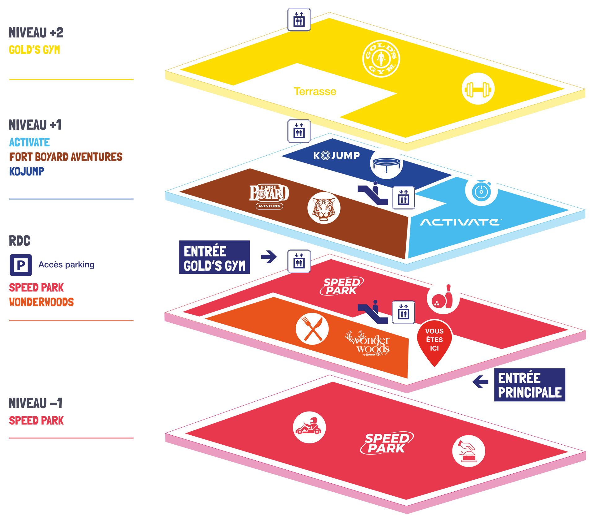 - Le concept Kojump qui propose des activités autour du trampoline, de l’escalade et une plaine de jeux sur une surface totale de 1 300 m².